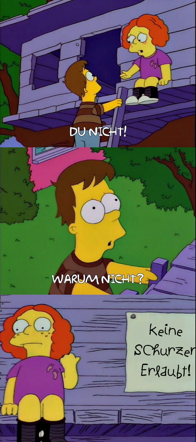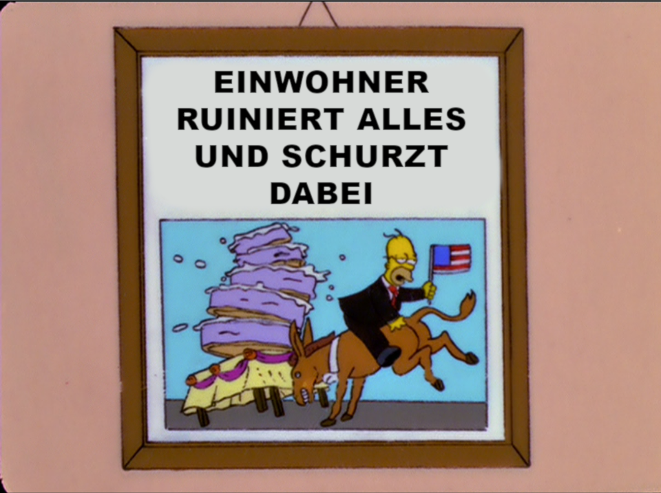 "Die haben Krusty auf Deutsch im Fernsehen." "Heil heil!!" "Ach du lieber, Krusty spritzen der Gaswasser!" "Jaja, Krusty spritzen der Gaswasser huhähähä." "Was für eine schöne Sprache."